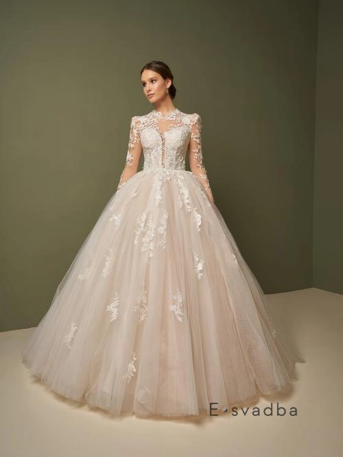 Весільні сукні, представлені на ESvadba, вирізняються оригінальним дизайном. Наприклад, тут можна знайти вбрання, оздоблені ручною вишивкою, мереживом, перлинами тощо.
