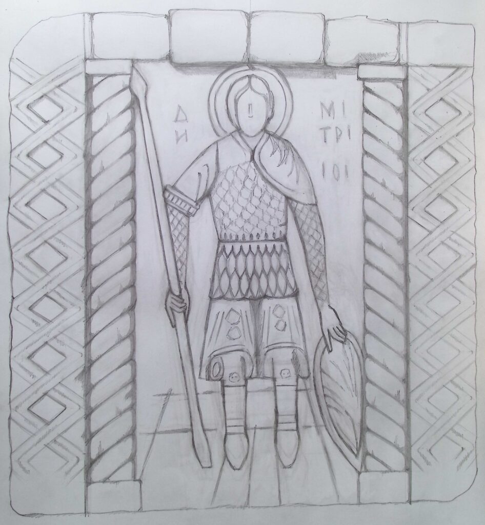 Плита являє собою підквадратний камінь-пісковик розмірами 39х41х15,5 см із вирізьбленим композиційним зображенням, в центрі якого іконографічний образ Святого Дмитра в обладунках, зі списом та щитом.
