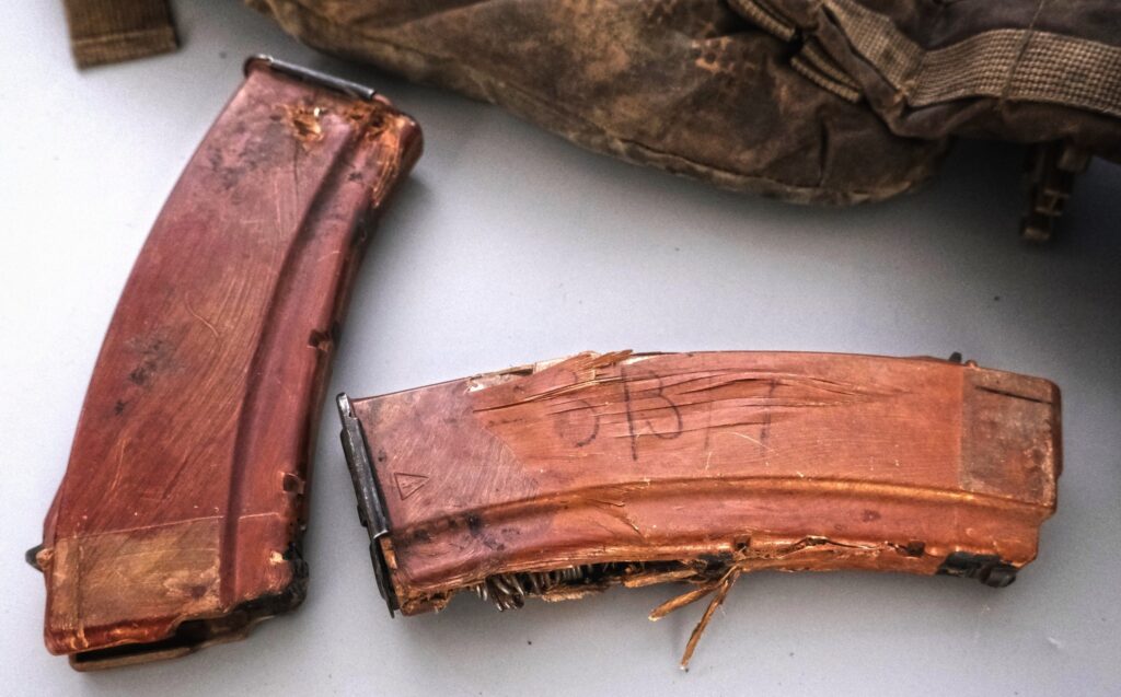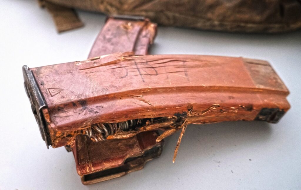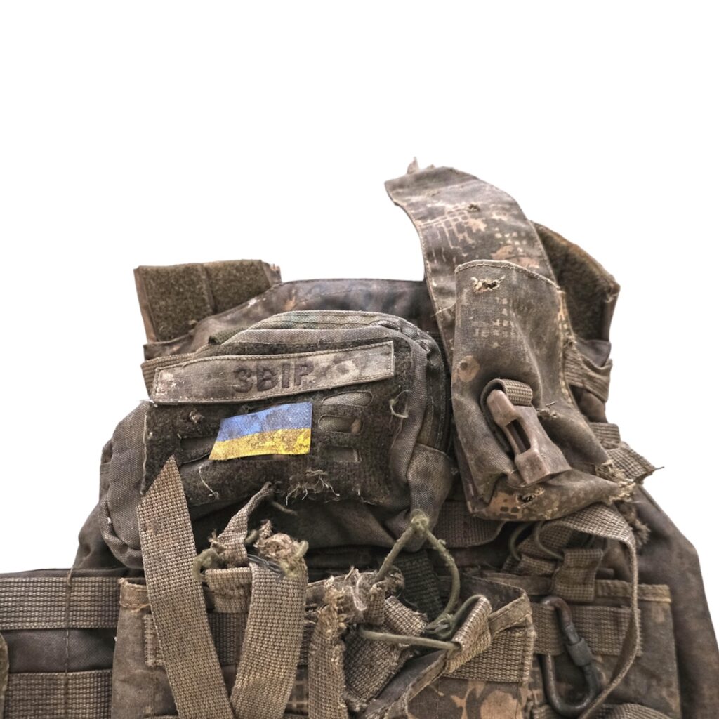 Плитоноска із бронеплитами та два магазини для АК-74 із написом псевдо Андрія – Звір, мають численні пошкодження, оскільки були на бійцеві у мить загибелі.