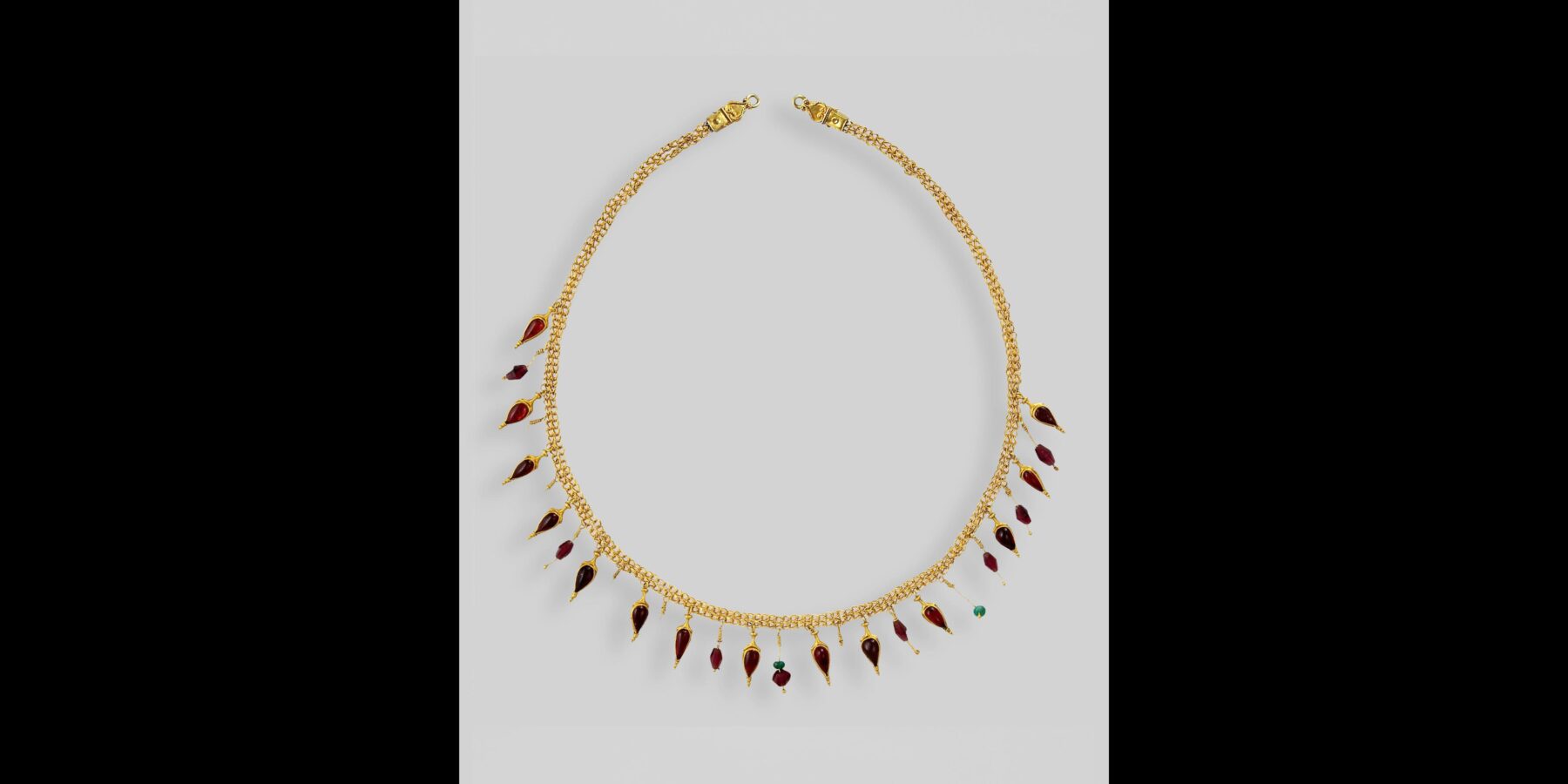 Одне із золотих намист складається з двох тонких ланцюжків, спаяних між собою через одне кільце, підвісок з гранатовими вставками, що чергуються з підвіскам із намистин.