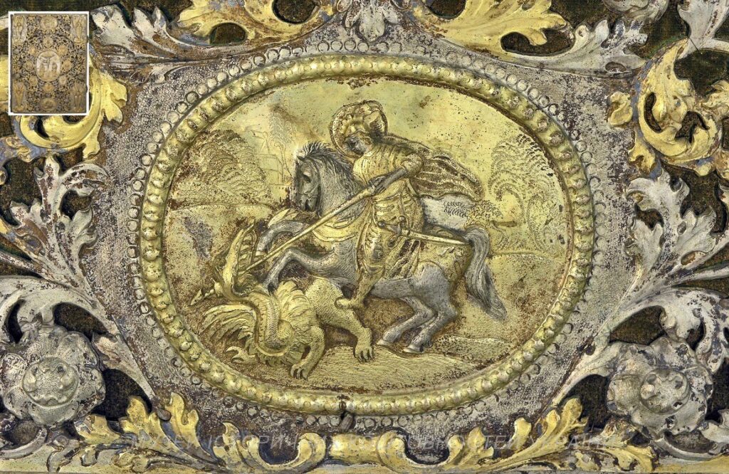 На чільній стороні оправи можна побачити в нижньому медальйоні зображення Святого Георгія (Юрія). Майстер відтворив найвідоміший подвиг Святого – перемогу над змієм.
