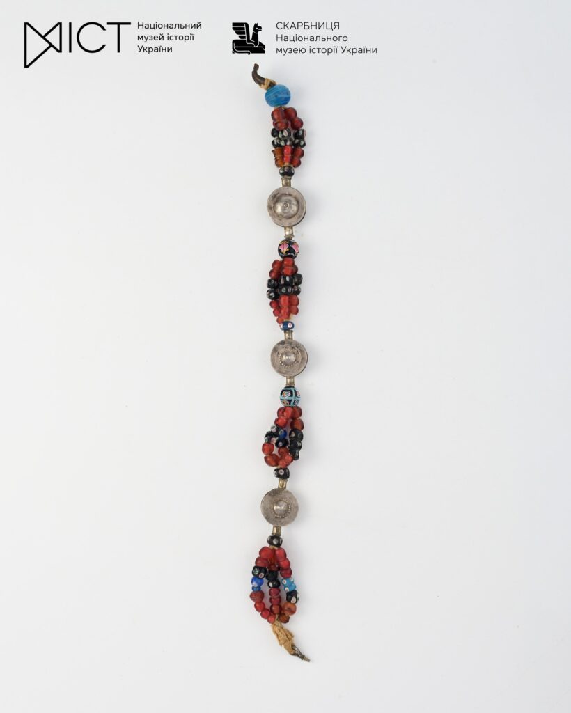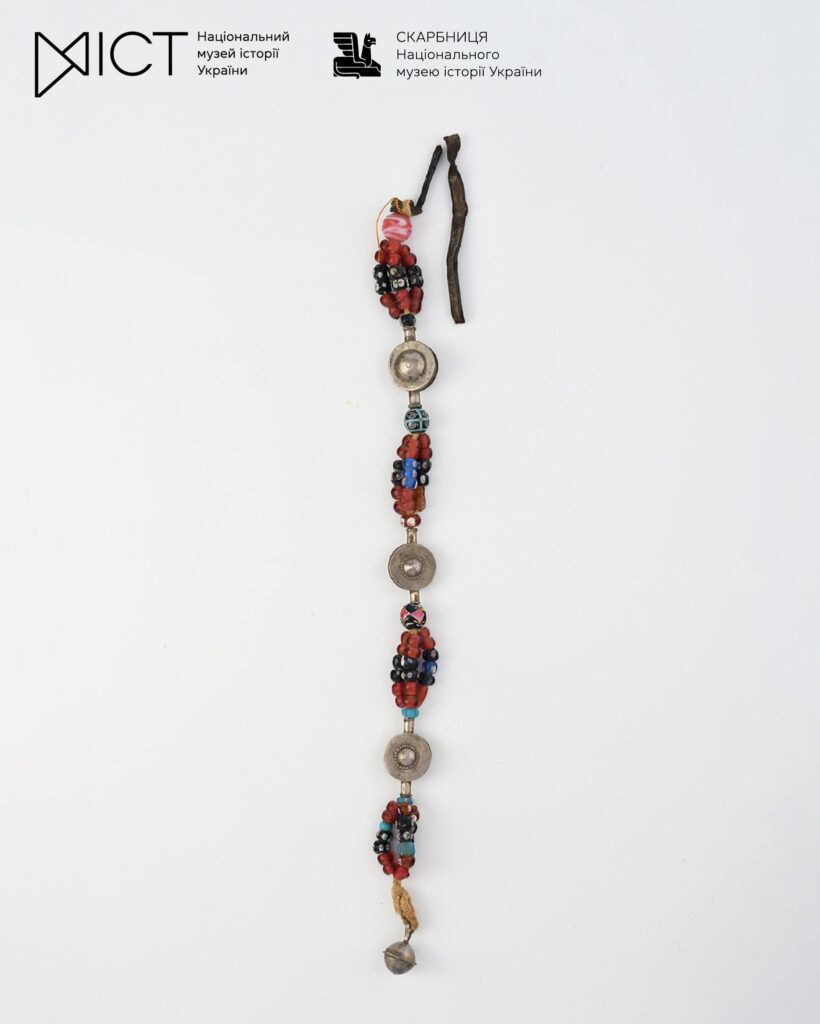 Так, вчені показали дві уплітки з колекції Скарбниці, виготовлені наприкінці ХІХ – на початку ХХ століття з різнокольорових скляних намистин, декоровані срібними куполками й бубонцем.