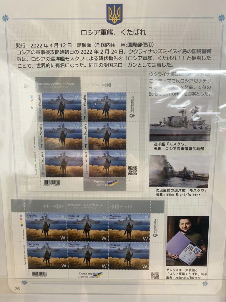 На ній представлені унікальні українські поштові марки з приватних колекцій японських філателістів. Зокрема, є стенди, присвячені першій марці воєнного часу «Русскій воєнний корабль, іді!..», українській вишивці, Київській Русі, маркам Української Народної Республіки, голоду в Україні в 1921-1923 рр., Київській області.