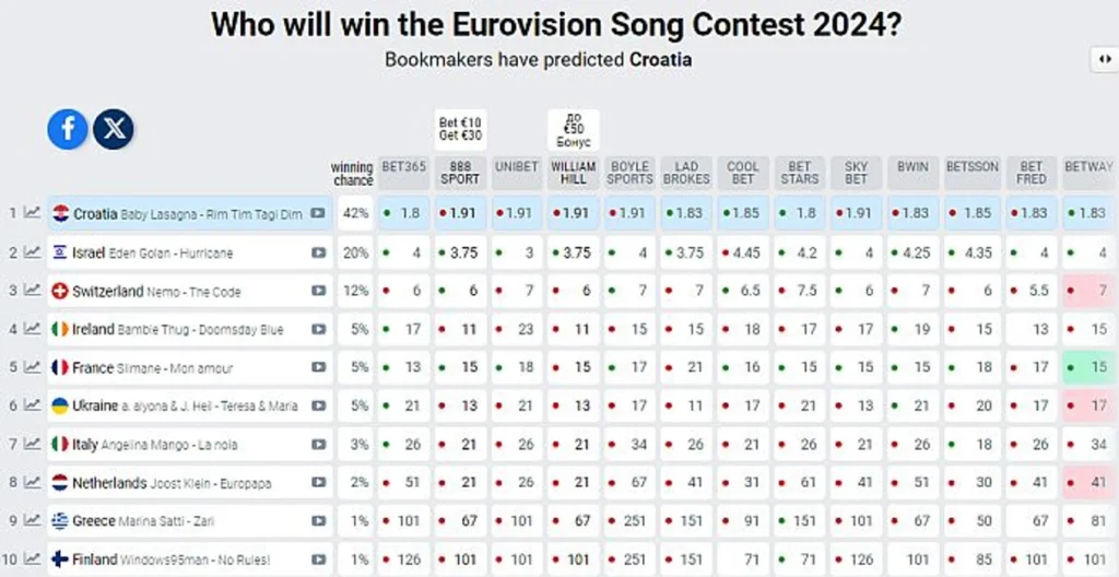 Перемогу у цьогорічному конкурсі, як і раніше, пророкують представнику з Хорватії. Друге місце наразі віддають Ізраїлю, а третє – Швейцарії. На четвертому тепер Ірландія, а 5-те місце прогнозують Франції.