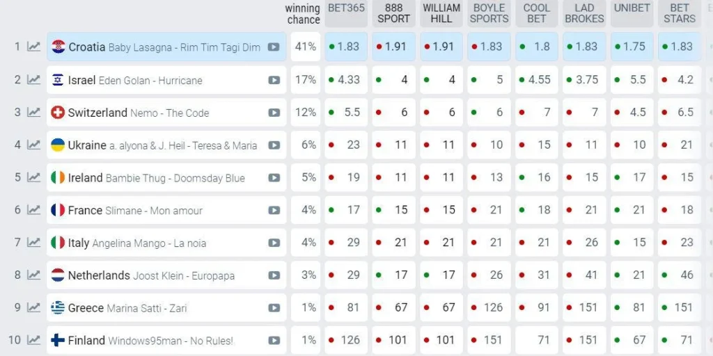 На 5 місці поки знаходиться Ірландія, після неї йде Франція. 7 місце пророкують Італії, 8 – Нідерландам. Завершують першу десятку представники Греції та Фінляндії.
