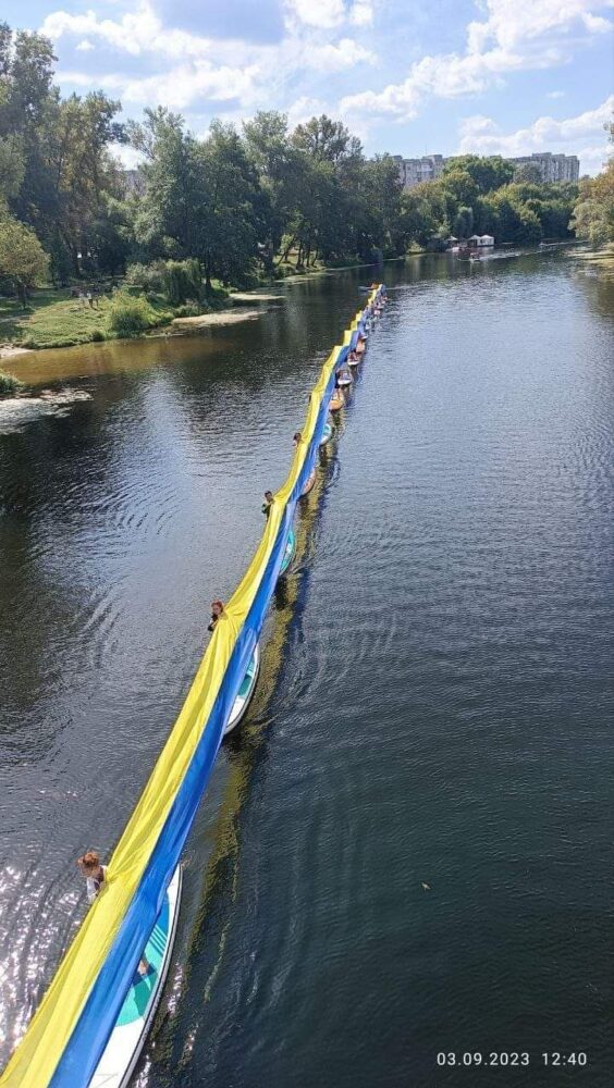 Учасники заходу підняли найдовший прапор України на воді аби залишити це у Книзі Рекордів України. Довжина стяга – 156 метрів, повідомляє Сумська міська рада.