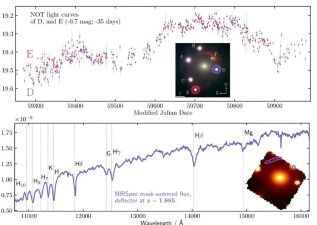 Вчені з’ясували, що перша гравітаційна лінза розташована на відстані 300 млн світлових років від квазара або 10,2 млн світлових років від нас. Світло квазара спочатку посилюється цією галактикою, що призводить до створення двох зображень, адже світло йде в різних напрямках.