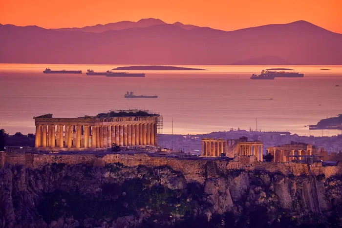 - Джордж Цафос — захоплюючий кадр Афінського Акрополя на заході сонця з видом на Егейське море.