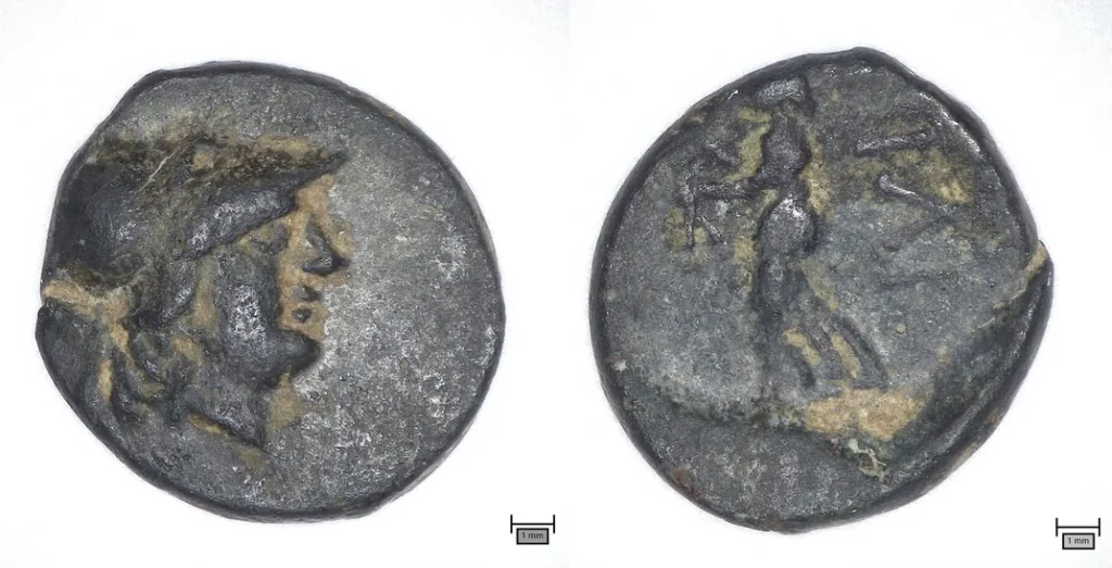 Монета має діаметр лише 12 міліметрів, але її значення для науки величезне. На аверсі зображено богиню Афіну у коринфському шоломі, а на реверсі – ту ж богиню з калатосом на голові, зі списом та веретеном у руках, повідомляє www.smithsonianmag.com.