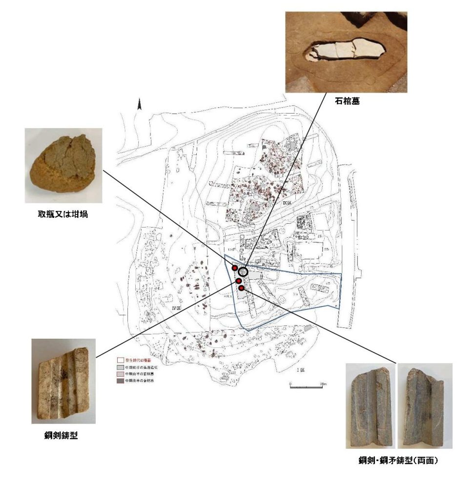 За словами префектури, форми, які, ймовірно, використовувалися для відливання мечів і списів, були знайдені в діапазоні від приблизно 5 метрів на північний захід до приблизно 10 метрів на південний захід від місця виявлення кам’яної труни.