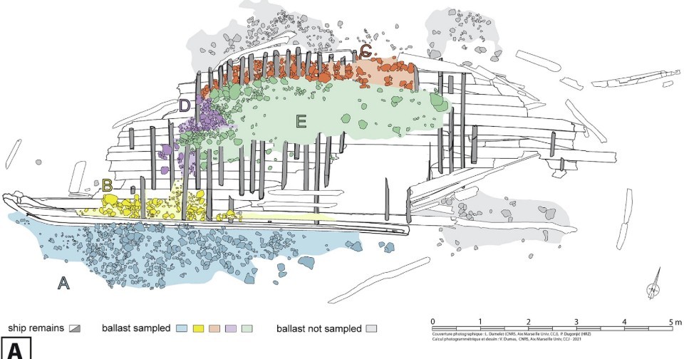 Корабель також містив баласт, що складався з численних камінців і бруківки. Франсуа Фурньє з Університету Екс-Марселя та його колеги з Італії, Франції та Хорватії вивчали це каміння. У 2021 році археологи підняли 854 камені діаметром від 1 до 40 сантиметрів, частину з яких відправили на петрографічний і мікропалеонтологічний аналізи, а також на ізотопні дослідження вуглецю, кисню і стронцію, повідомляє cikavosti.com
