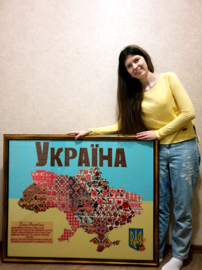 Так, дівчина вручну вишила карту і фрагмент гімну України на тлі національного прапора. На цей їй знадобилося 1,5 роки роботи.