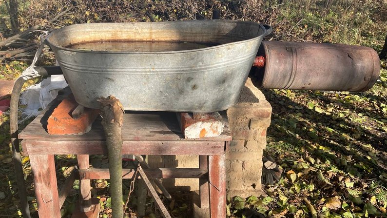 “Оце все діло я переганяю ще раз. Додаю водичку на дно, щоб був температурний затор, щоб не перегрілося більше 100 градусів, щоб ішов чистий бензин, потім водичка, тоді керосин, солярка, все по черзі нагріву. Оцей бензин, октанове число, канєшно, слабувате: десь 76-тий, максимум 80-тий. Жигулі на ньому їздять відмінно, мій мотоцикл-мопед їздить прекрасно”, – зауважує чоловік.