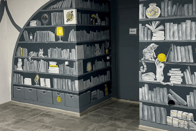 В укритті заборонено встановлювати декоративні конструкції. Тому від ідеї казкового комину та балок на стелі відмовилися, проте стіни прикрасили розписами, каже команда, повідомляє village.com.ua.