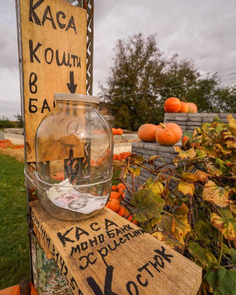 Ціни намальовані на гарбузах. Усі, хто бажає придбати товар, мають покласти гроші до трилітрової банки.