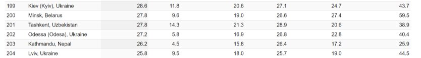 Одеса, перлина Чорного моря, розташувалася на 202 позиції з показником 27,2%. Львів, культурна столиця Заходу України, посів 204 місце з індексом 25,8%.