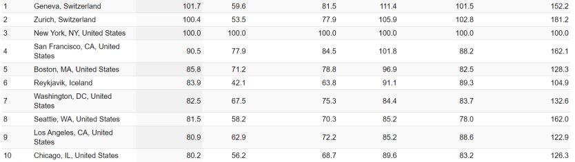 З 6 по 10 місця зайняли: Рейк’явік, Ісландія (83), Вашингтон, округ Колумбія, США (82,5), Сіетл, Вашингтон, США (81,5), Лос-Анджелес, Каліфорнія, США (80,9), Чикаго, Іллінойс, США (80,2).