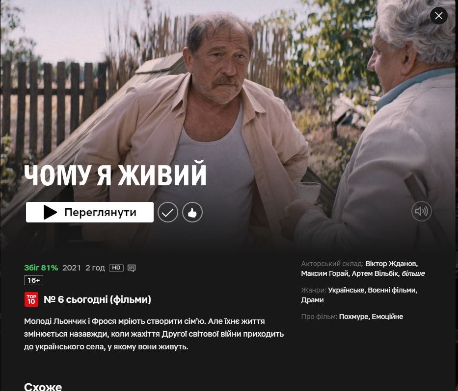 Український фільм “Чому я живий” увійшов у ТОП-10 фільмів на стримінговій платформі Netflix, пише Успіх in UA.